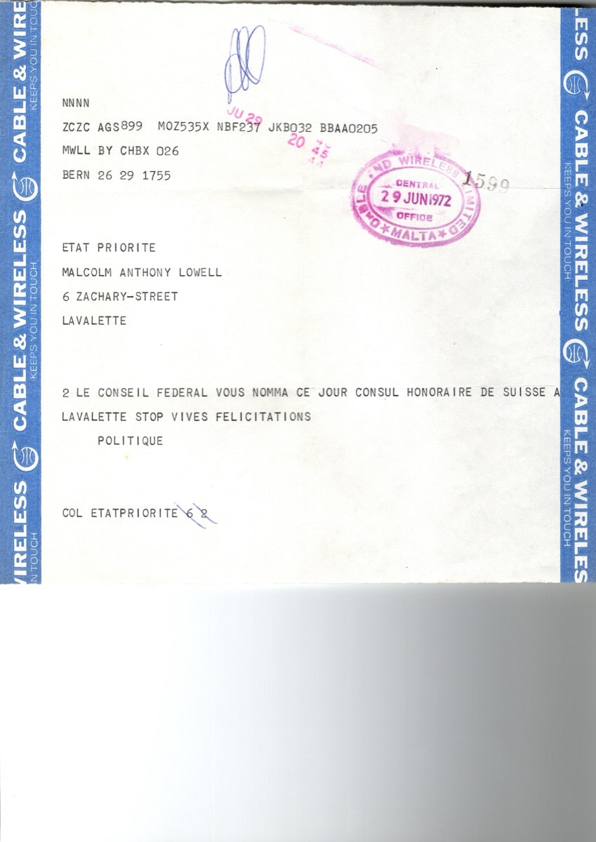 Malcolm A. Lowell appointed Honorary Consul of Switzerland.